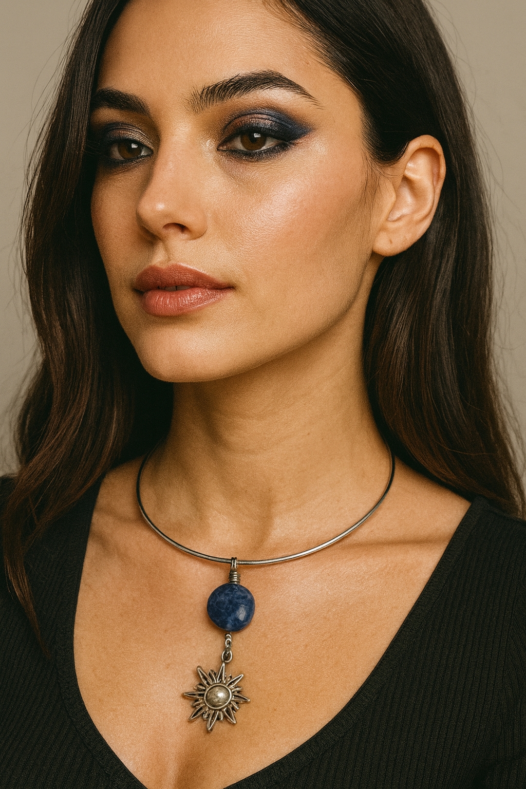 choker colar com pingente de pedra natural sodalita. choker de alumínio, levinho e não sai a cor.