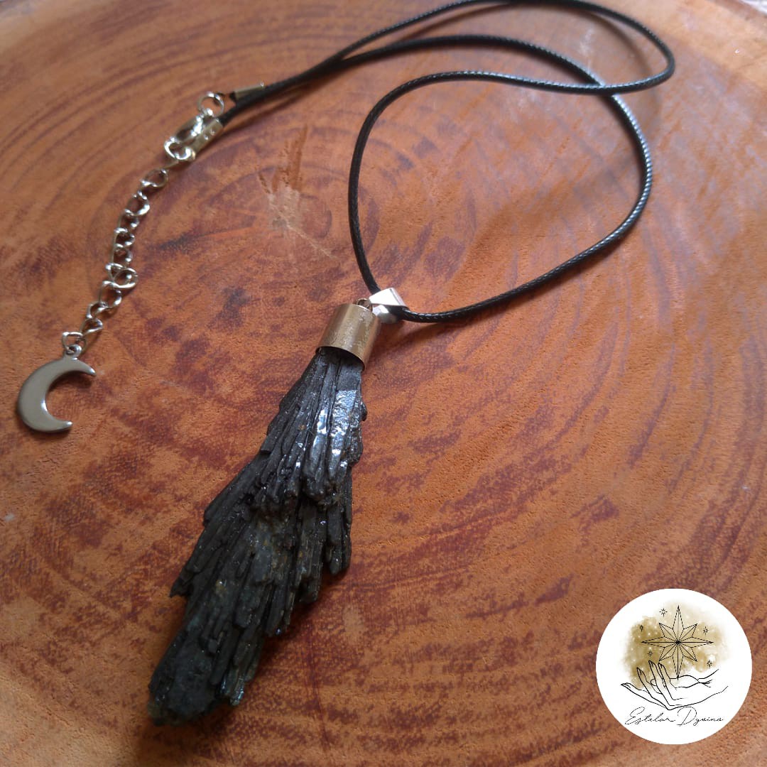 Colar com pingente de cianita negra, vassourinha de bruxa